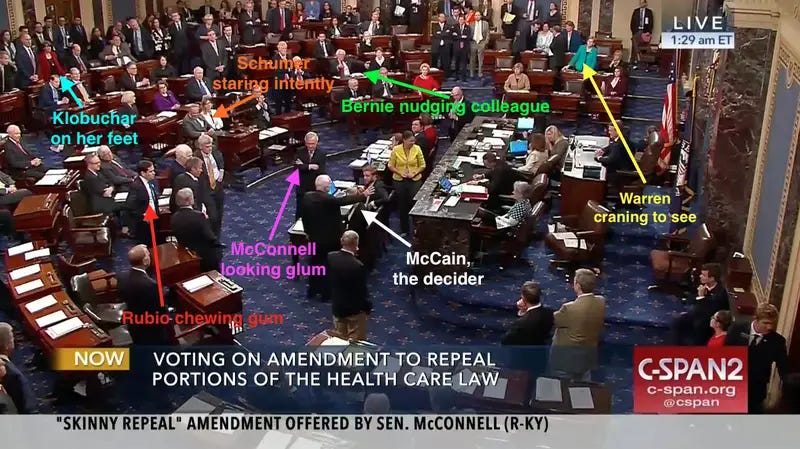 Still, I was surprised by Senator John McCain’s downturned thumb, the lethal third no vote in the Senate. There would actually end up being seven, but McCain gave permission to the subsequent four.