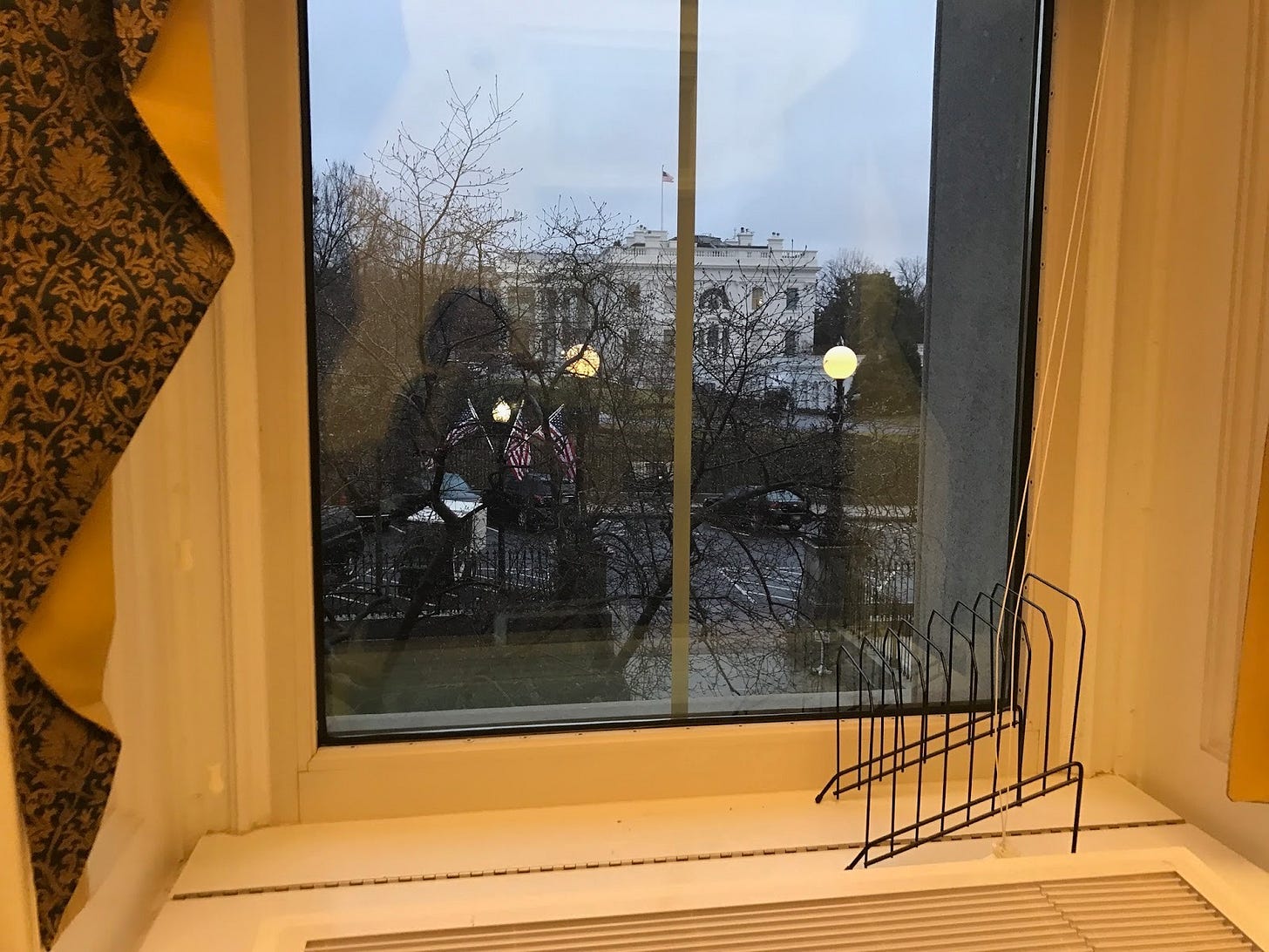 We didn’t have any furniture or supplies. Although our boss, along with the heads of the NEC and NSC, worked in the West Wing – about the size of my Capitol Hill townhouse – the rest of us had managed to box out the speechwriters and scored the absolute best suite on the first floor of the Old Executive Office building, facing the West Wing. This was conveniently close to the entrance so that we could run back and forth between the two, fifty times a day (for all those very, very important meetings… well, and also, the 24/7, unlimited Diet Coke supply on the first floor).
