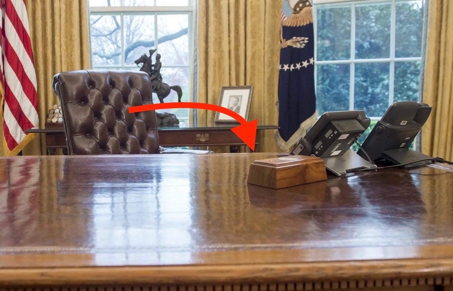 He leaned over his desk with the excited expression of a 10-year old boy and, with his pointed index finger, pushed a big button on a little wooden box next to his phone.